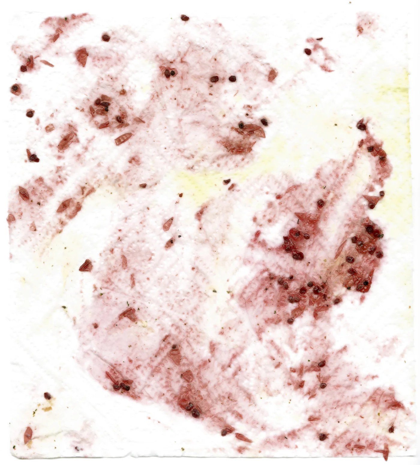 Translating to "I was hungry," this series features enlarged paper towels with food remnants such as butter and jam or curry. In this project, the paper towels are scanned rather than photographed, allowing for a much larger digital negative to print large-format photographs. The images are printed on textured watercolor paper, then cut out of their frame to include the paper towels' nuanced edges. From a distance, they appear to be abstract paintings of minimal color, but from close-up, their heightened photographic detail is revealed.